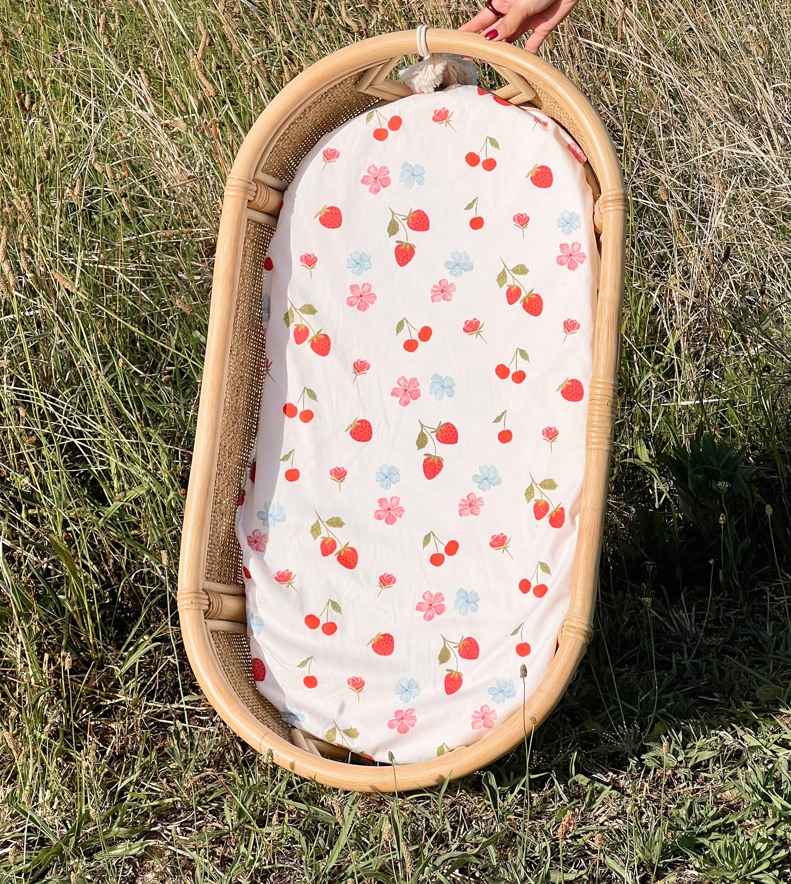 The Evie print is a hand drawn design featuring flowers, cherries and strawberries.