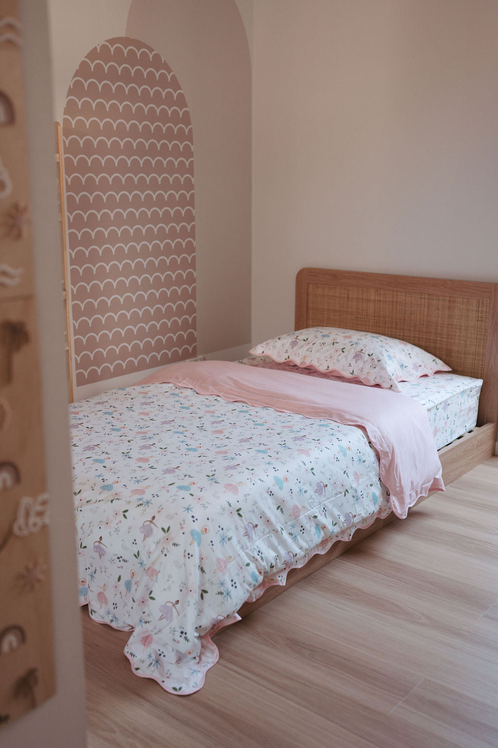 The perfect blend of style and practicality, our Single Doona Cover & Pillowcase Set is designed for kids’ rooms that deserve both beauty and versatility. Each doona and pillowcase set is double-sided, with a playful print on one side and a matching solid colour on the other; so you can flip and change the look whenever you like. Made from soft, breathable organic cotton, this set keeps little ones cosy through the night while making bed styling simple for you.